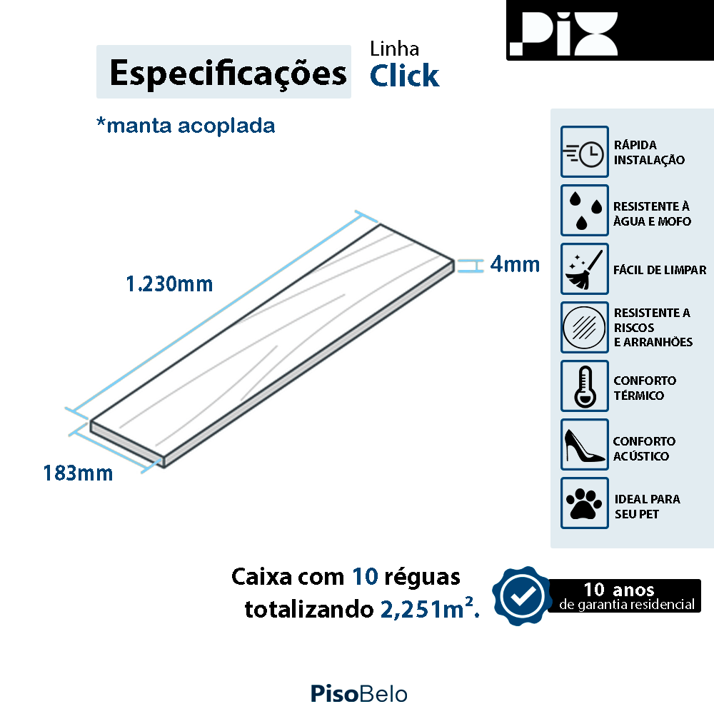 O piso vinílico Pix, modelo Sena, da linha Clicado, oferece uma combinação perfeita de praticidade e design sofisticado. Com alta resistência ao desgaste e fácil instalação, é ideal para qualquer espaço, seja residencial ou comercial. Seu sistema clicado garante agilidade na aplicação, sem necessidade de cola. Transforme seu ambiente com a qualidade e beleza que a Pix proporciona!