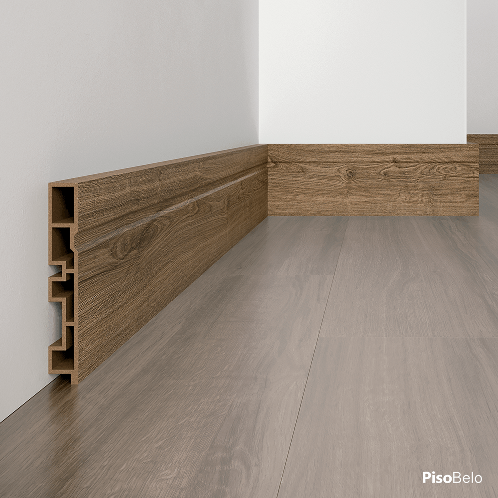 A alta tecnologia aplicada a nova linha ACQUA NEW une partículas finas de madeira, proveniente de florestas de reflorestamento certificadas à resina plástica (PVC), conferindo propriedades termoplástica à mistura o que agrega alta resistência e durabilidade aos rodapés. O Rodapé Acqua New, um produto revolucionário na categoria de rodapés. 100% reciclável e à prova d`água, o Acqua New é sustentável e ecológico, pois é totalmente produzido a partir de finas partículas de madeira de eucalipto cultivado em florestas certificadas com os selos FSC de Cadeia de Custódia e de Manejo Florestal. A alta tecnologia aplicada ao processo une essas finas partículas de madeira ao PVC, resultando no WPC (Wood Polymer Compositor), cujo substrato é 100% sustentável, super durável, imune a inseto xilófagos (cupins), que já vem acabado sem a necessidade de pintura.