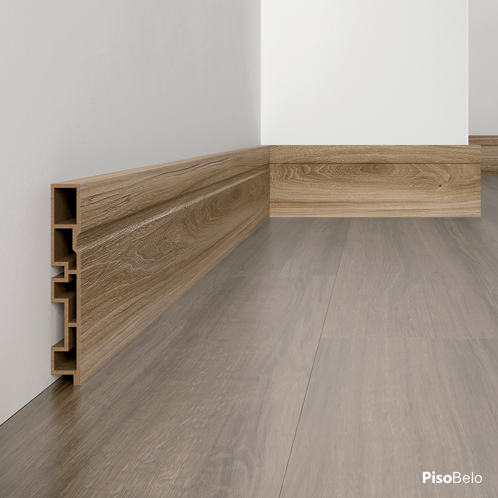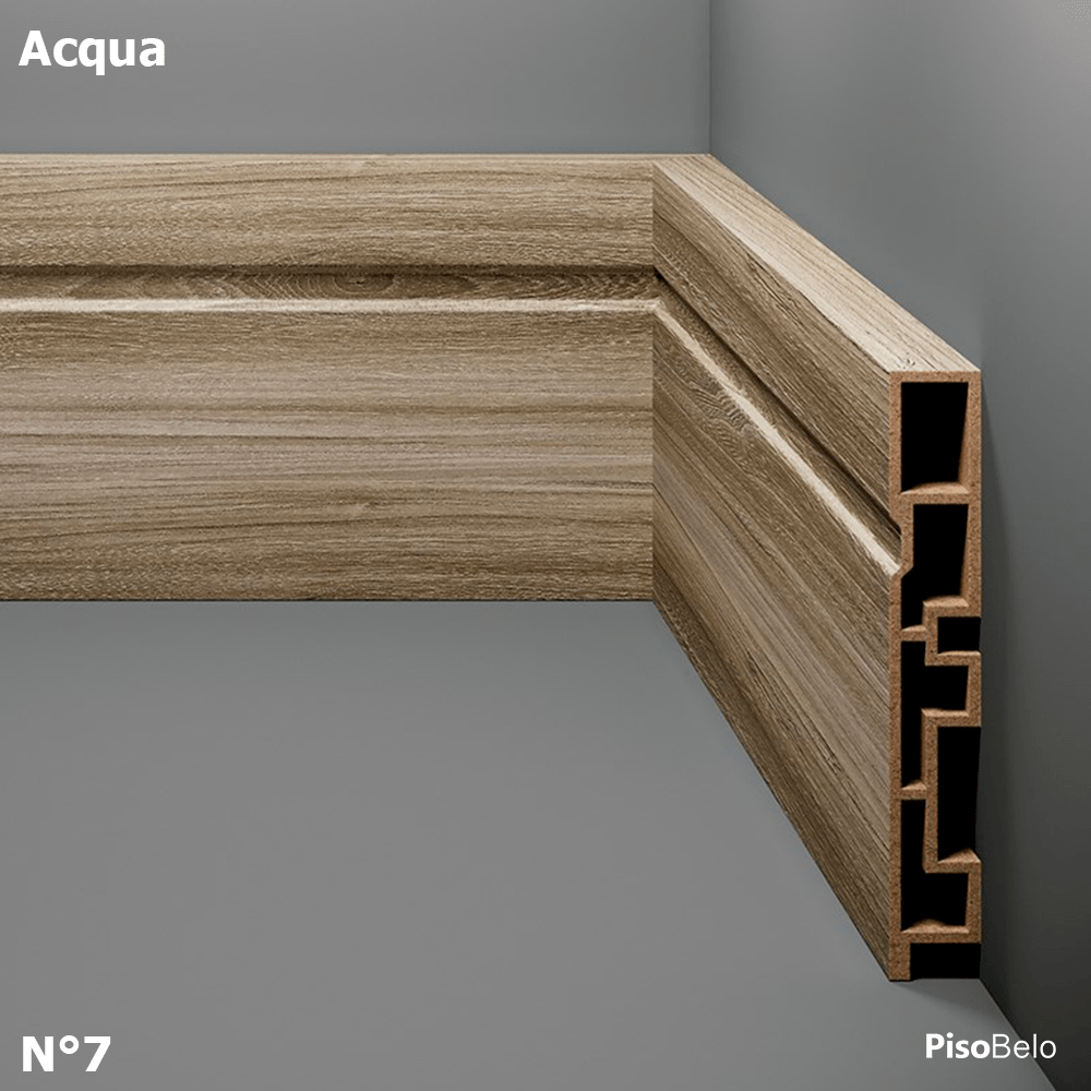 A alta tecnologia aplicada a nova linha ACQUA NEW une partículas finas de madeira, proveniente de florestas de reflorestamento certificadas à resina plástica (PVC), conferindo propriedades termoplástica à mistura o que agrega alta resistência e durabilidade aos rodapés. O Rodapé Acqua New, um produto revolucionário na categoria de rodapés. 100% reciclável e à prova d`água, o Acqua New é sustentável e ecológico, pois é totalmente produzido a partir de finas partículas de madeira de eucalipto cultivado em florestas certificadas com os selos FSC de Cadeia de Custódia e de Manejo Florestal. A alta tecnologia aplicada ao processo une essas finas partículas de madeira ao PVC, resultando no WPC (Wood Polymer Compositor), cujo substrato é 100% sustentável, super durável, imune a inseto xilófagos (cupins), que já vem acabado sem a necessidade de pintura.