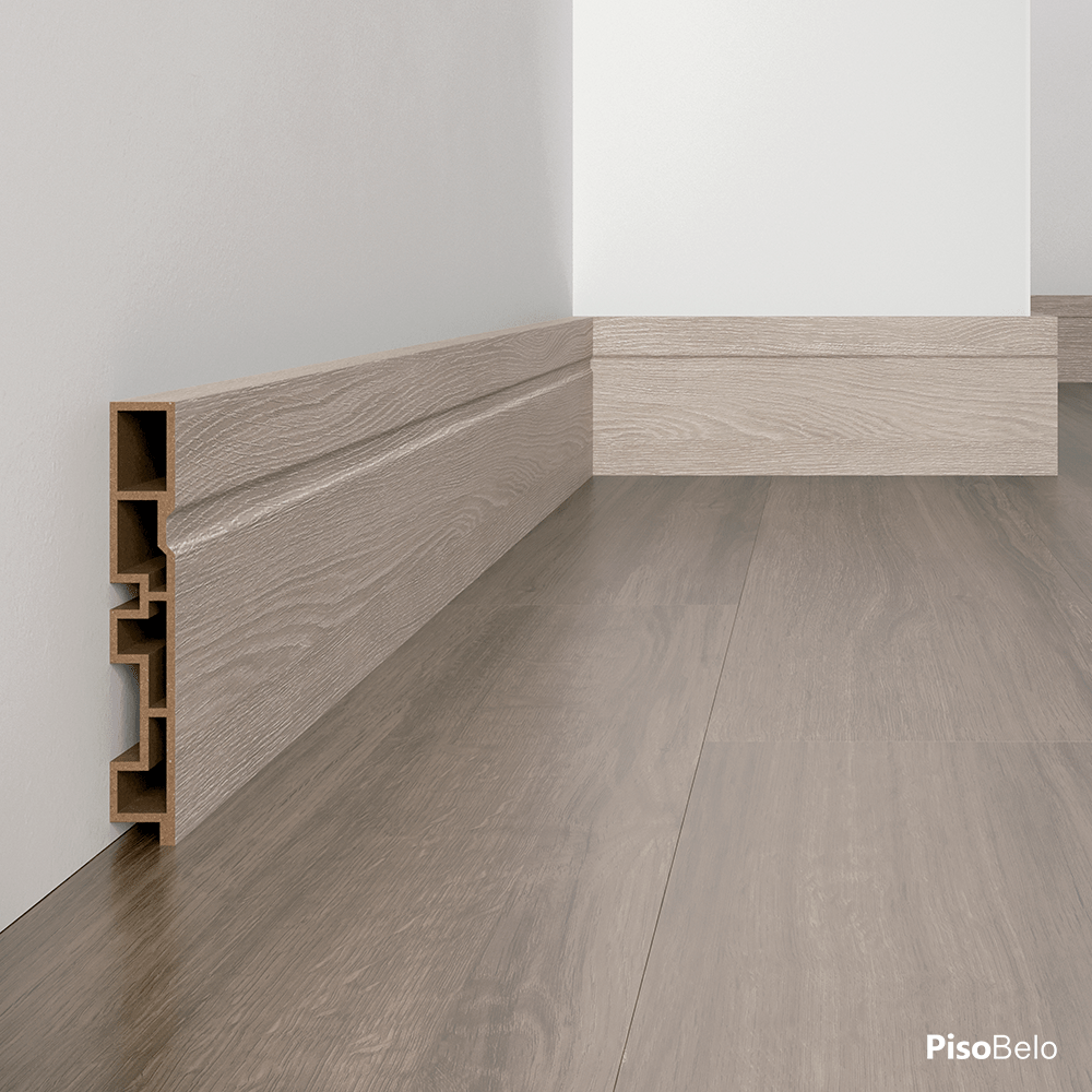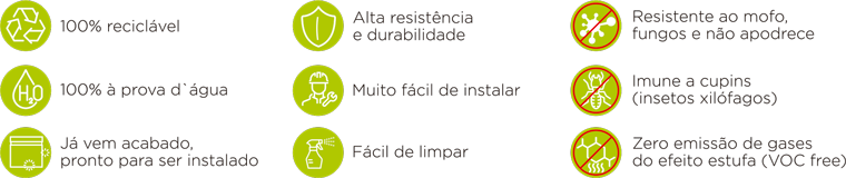 A alta tecnologia aplicada a nova linha ACQUA NEW une partículas finas de madeira, proveniente de florestas de reflorestamento certificadas à resina plástica (PVC), conferindo propriedades termoplástica à mistura o que agrega alta resistência e durabilidade aos rodapés. O Rodapé Acqua New, um produto revolucionário na categoria de rodapés. 100% reciclável e à prova d`água, o Acqua New é sustentável e ecológico, pois é totalmente produzido a partir de finas partículas de madeira de eucalipto cultivado em florestas certificadas com os selos FSC de Cadeia de Custódia e de Manejo Florestal. A alta tecnologia aplicada ao processo une essas finas partículas de madeira ao PVC, resultando no WPC (Wood Polymer Compositor), cujo substrato é 100% sustentável, super durável, imune a inseto xilófagos (cupins), que já vem acabado sem a necessidade de pintura.